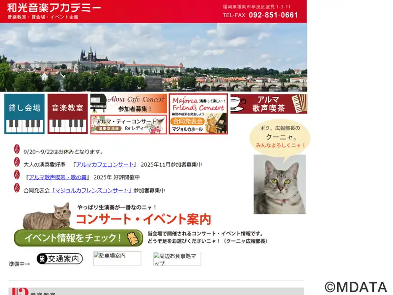 福岡市早良区にある音楽教室・貸しスペースで、音楽への探求心を育む場所としてサービスを提供。ピアノ、声楽、ヴァイオリンなどのレッスンを開講し、初心者から上級者、子どもからシニアまで、それぞれのレベルに合わせた指導を、経験豊かな講師が提供する。練習や発表会に最適なレンタルスタジオも完備。2階には、優れた音響性能を誇るマジョルカホールがあり、発表会や公開レッスン、アンサンブル練習など多目的に使用できる。