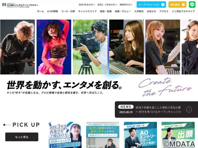 VAOはダンス(2020年度新設)、ミュージシャン、音響/コンサートスタッフ、マスコミ出版・芸能(2021年度新設)、声優・俳優、アニメ音響&ゲームサウンド、写真、放送・映画の8分野で、プロとして業界で活躍する人材を育成する専門学校です。東京・名古屋・九州に姉妹校をもつ伝統校(Adachi学園グループ)、総合学校ならではの講師とカリキュラム、業界仕様トップクラスの環境・設備で幅広く技術を習得。