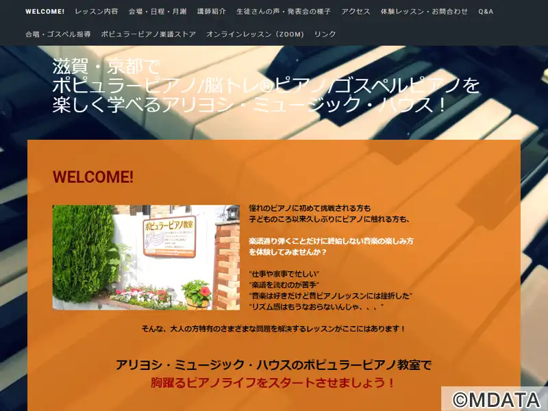 大津市のアットホームなポピュラーピアノ教室。大人を主な対象とし、初心者から経験者まで幅広く対応。クラシックだけでなく、J-POPや洋楽、ジャズ、ゴスペルなど多様なジャンルを学ぶことができる。楽譜通りの演奏にとどまらず、コードネームを使ったアレンジや即興演奏など、自分らしい表現力を育む実践的な指導が特徴。市販の楽譜に頼らず、自作コード譜によるサポートも充実しており、自由に音楽を楽しめる環境が整う。