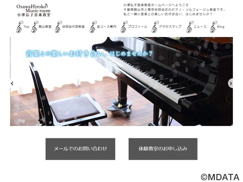 PTNA千葉館山ステーション代表の小澤弘子氏が主宰するピアノ・ソルフェージュ教室。館山市と世田谷区代田の2教室を開設。館山教室は2台のグランドピアノを完備し、夜10時までレッスン可能。リトミックやソルフェージュを効果的に取り入れ、年齢・進度に応じたカリキュラムで基礎を築き、自立したレッスンへと導く。大人のピアノ、音大受験コースもあり、ピティナピアノステップ、各コンクールやグレード試験に対応。