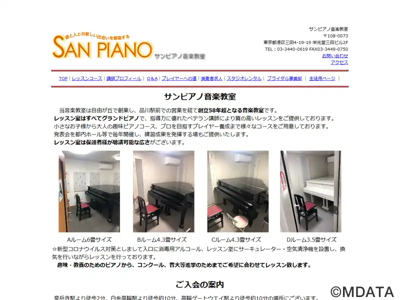 港区の泉岳寺駅から徒歩2分の場所にあるサンピアノ音楽教室。ブライダル・ラウンジプレーヤー養成を中心に、ピアノ、ボーカル、バイオリン、ギター、1曲マスターコースなど様々なコースを開講。幼児(3歳から)から大人まで、趣味からプロ養成まで幅広く、ベテラン講師による質の高い指導が受けられる。レッスン室は、保護者の聴講も可能で、生徒の成果を披露する発表会を毎年都内ホールで開催している。スタジオレンタルもあり。