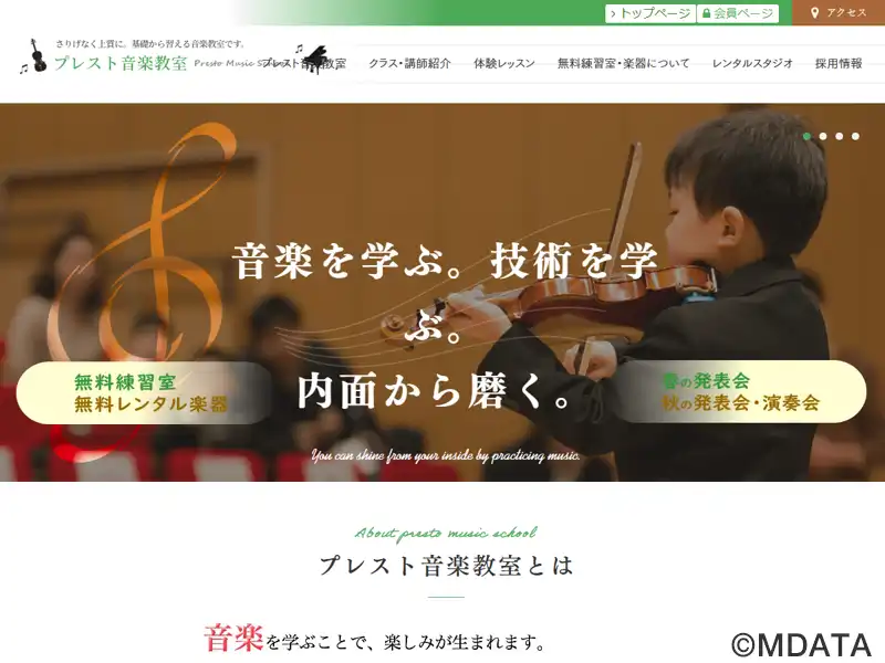 文京区・茗荷谷の春日通り沿いにある音楽教室。弦楽器や木管・金管楽器、ピアノ、チェンバロ、ハープ、クラシックギター、声楽、作曲などの多彩なクラスがあり、基礎から高度なレベルまで、初心者から音大受験まで、丁寧な個人レッスンで、演奏技術と音楽性を学ぶことができる。また、レンタルスタジオとして、本館に8つの個人練習室とグランドピアノ常設のアンサンブルスタジオ、別館にサテライトスタジオ2部屋を設けている。