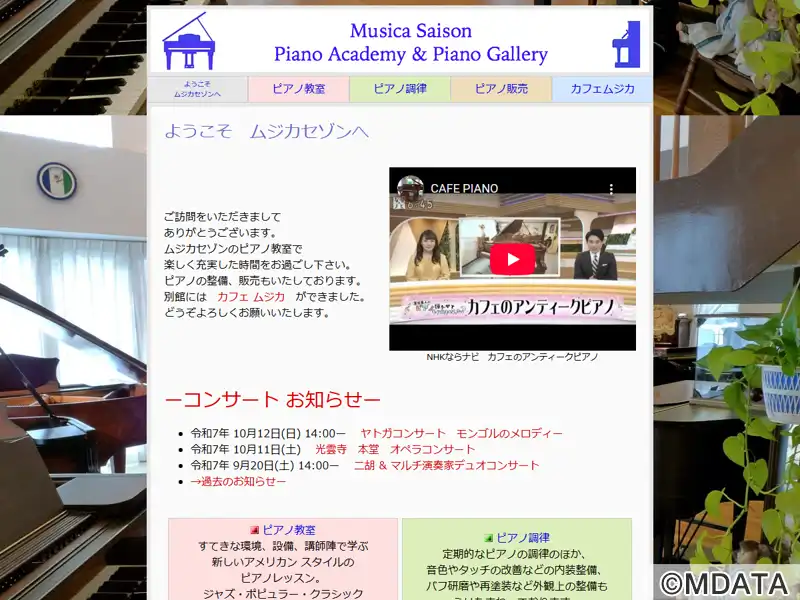 奈良登美ケ丘にあるピアノ教室・ギャラリー。ジャズ、ポップ、クラシックピアノの初歩からプロレベルまで、経験豊富な講師がマンツーマンレッスンを行う。また、定期的なピアノ調律や、音色やタッチの改善、内装整備、バフ研磨や再塗装などの整備も行っている。ピアノの販売についても、魅力的なピアノを揃え、古いピアノも修復、整備する。サロンコンサートができるピアノカフェ「カフェムジカ」も運営。演奏披露の場所となっている。