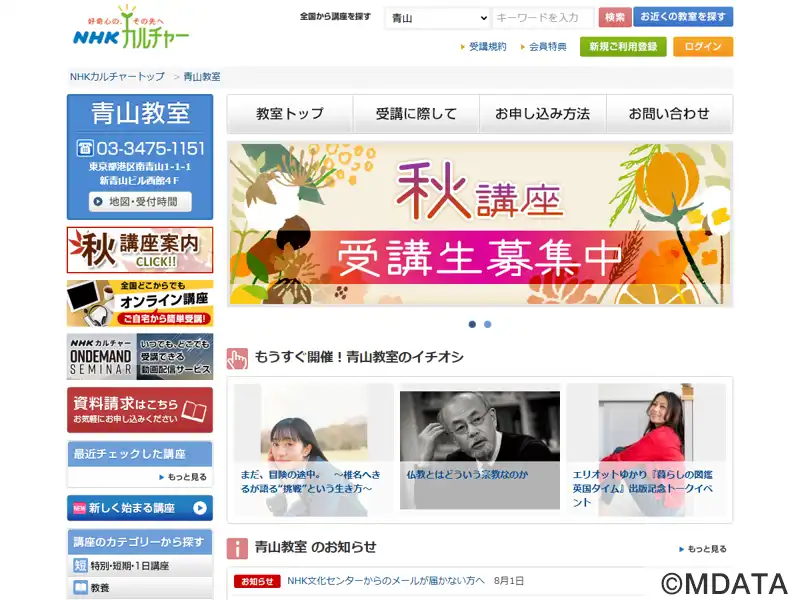港区の青山一丁目駅から徒歩1分にある、株式会社NHK文化センターのカルチャー教室。「好奇心の、その先へ」を合言葉に、全国で多彩な講座を提供している。NHKの番組に関連する講座など、NHKグループだからこそできるサービスも提供する。音楽講座としては、ボイストレーニング、フルート、バイオリン、ビオラ、ピアノ、ウクレレ、フォークギター、クラシックギター、ヘルマンハープ、オカリナなどのコースを開講している。