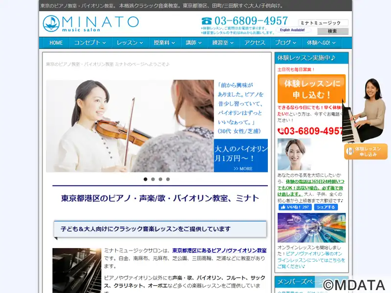 東京港区芝浦を拠点とするクラシック専門の音楽教室。ピアノ、バイオリン、チェロ、フルート、サックス、クラリネット、声楽、ソルフェージュなど、多彩な楽器のレッスンを提供し、0歳から大人まで幅広い年齢層に対応。東京藝大や桐朋学園大学など名門音大出身の講師が、優れた演奏技術と指導力で丁寧に指導する。20部屋のレッスン室やサントリーホールなどでの発表機会が整い、初心者から音大志望者まで学びやすい環境が特徴。