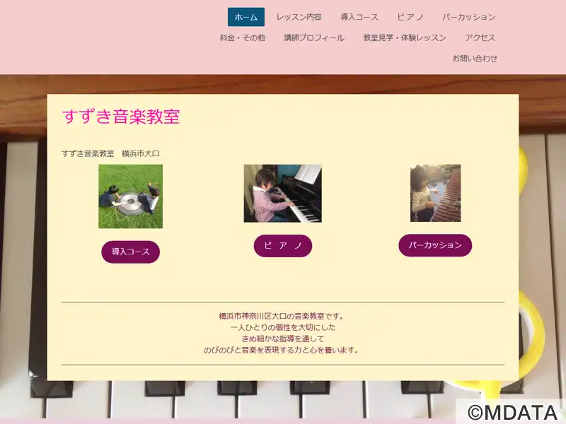 横浜市大口にある子供向け音楽教室。個々の個性を重視し、細やかな指導を通じて音楽表現の力と心を育む。ピアノ、リトミック、ソルフェージュ、パーカッションのレッスンを提供する。3歳からの導入コースでは、パーカッションやピアノを使ってさまざまな音色やリズムに触れる。また、4歳以上を対象としたピアノレッスンでは、音感、リズム感、初見視唱、記譜法、音楽用語の知識を培う。一人ひとりの成長をサポートしている。