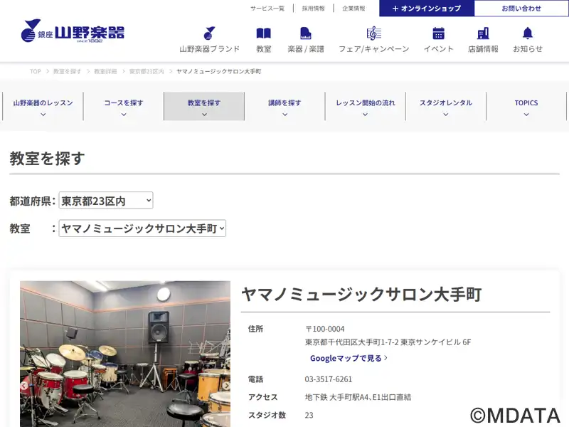 東京都代田区の大手町駅A4・E1出口に直結する、東京サンケイビル メトロスクエア6階に、2019年オープンした山野楽器のレッスンセンター。23部屋のレッスンルームを備え、快適で広々としたラウンジやイベントスペースも完備。大人向けのヤマハミュージックスクールを中心に、ピアノ、ギター、ドラム、フルート、バイオリンなど50種類以上のコースを提供。初心者から経験者まで対応する多様なレッスンが用意している。