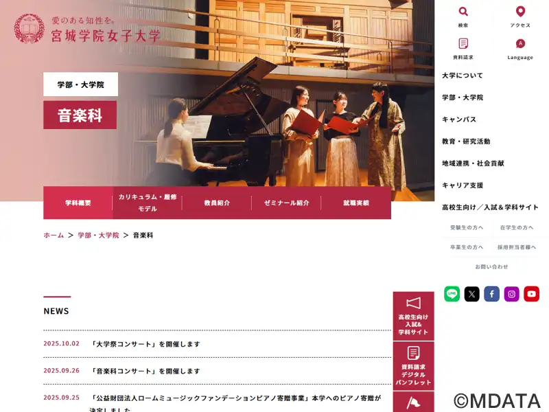 仙台市にある宮城学院女子大学の音楽科。東北で唯一の4年制の音楽科として、幅広い知識と技術を身につけ、音楽の世界を深く学ぶ。実技を中心にアンサンブル、音楽史、音楽理論、教職科目などをバランス良く学べるカリキュラムを用意している。アットホームな環境で、各自の音楽経験に合わせた指導を行う。演奏技術や音楽の専門知識だけでなく、コミュニケーション能力や人間性を磨くための教育、発表会など実践の場も提供する。
