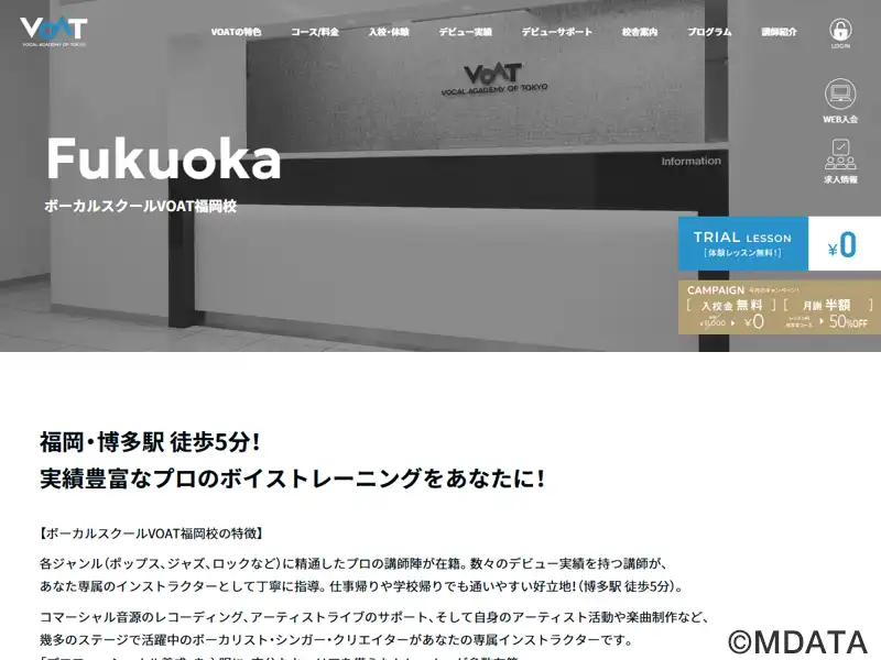 福岡市博多区の祇園駅前にあるボーカルスクール。生徒の個性と目的に合わせた指導で、多彩なジャンルのアーティストを育成している。プロコースでは、メジャーデビューを目指す生徒に向けた特別レッスンやオーディションの機会が提供。目標の実現を全面的にサポートします。フリータイム制のレッスンスケジュールと快適な学習環境で、生徒は自分のペースで学び、成長することができる。歌唱力とアーティスト性を最大限に引き出す