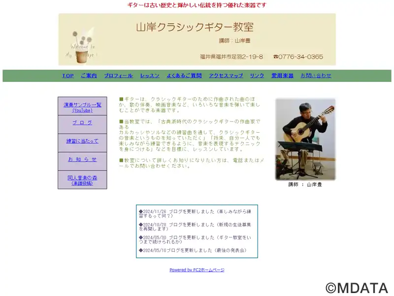 福井市にあるクラシックギターの正しい弾き方を学ぶための教室。古典派時代のクラシックギターの作曲家であるカルカッシやソルなどの練習曲を通して、クラシックギターの音楽を追求する。レッスンは、生徒と講師の一対一の個人レッスン形式。楽譜が全く読めない方や、初めて楽器を始める人にも丁寧に指導する。毎年、発表会を開催。将来的には、自分自身による練習を重ねることで、音楽表現を磨いていけるテクニックの習得を目指す。