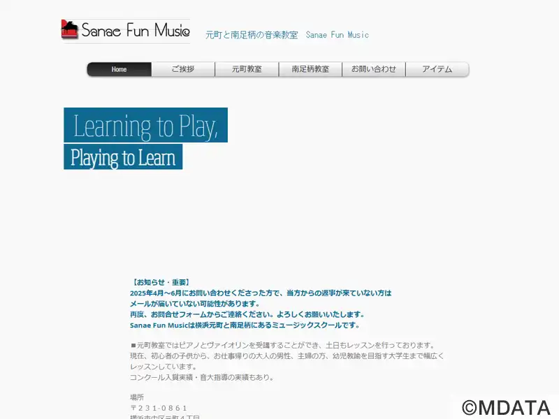 神奈川県の横浜中区元町と南足柄市にあるミュージックスクール。「ひとりひとりの個性を尊重し、丁寧に・ゆったりとレッスンすることができる教室」を掲げ、子どもの個性を大事にするレッスンを行う。ピアノとヴァイオリン(元町教室のみ)コースを開講。子供から、初心者、社会人の方、主婦の方、幼児教諭を目指す大学生まで幅広くレッスンを行う。コンクール入賞実績や音大指導の実績もあり。レッスン用のバイオリンレンタルも行う。