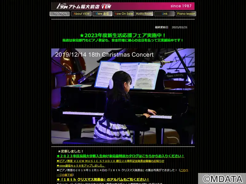 家電専門店のアトム福大前店VIEWの店内奥にある、ピアノレッスンスタジオ。初心者にも親切に指導する、ジャズ・ポピュラー・クラシックピアノ教室を開催。子供向けのレッスンでは、ソルフェージュを併用し、ポピュラー曲やアニメソングなども取り入れている。英語でのレッスンも可能。大人向けのレッスンでは、好きなジャンルの曲を短期間でマスターするためのテクニックを指導する。ジャズバンドとのアンサンブル練習も行う。