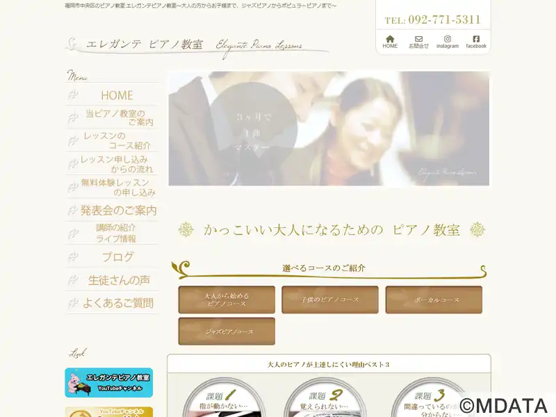 福岡市で演奏活動を行う松村暢子氏が指導するピアノ教室。「いかに楽しく練習できるか?」を考え、個人のレベルに合わせたプログラムで、経験歴や音楽のジャンル問わず、幅広い世代にレッスンを行う。子供のピアノ、大人から始めるピアノ、ポピュラー・ジャズ・クラシックピアノ、シニアコース、保育士養成コース、ボーカルコース(グループも可)等を開講。短期間で一曲マスターするための大人向けレッスンもあり。毎年発表会を開催。