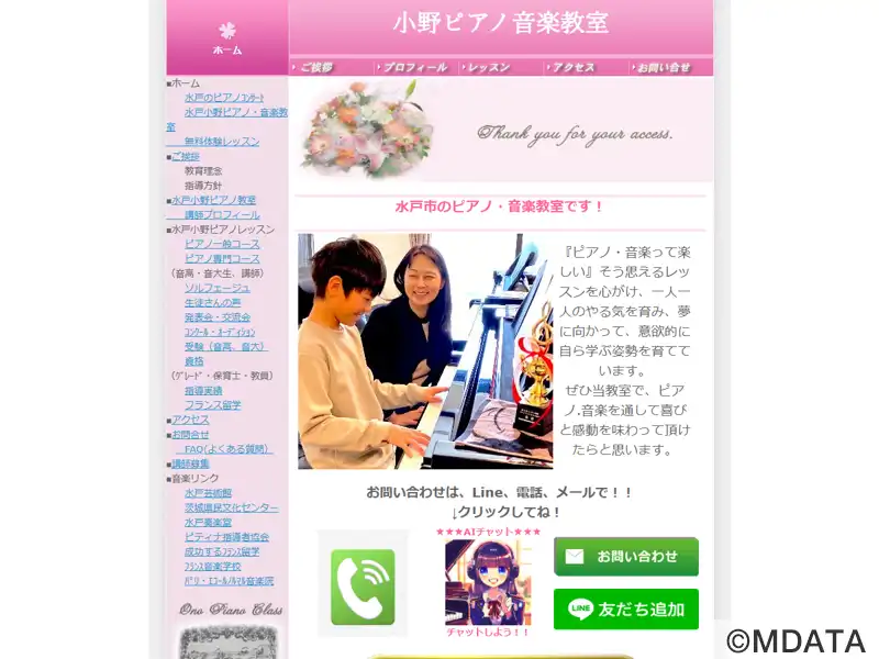 水戸の偕楽園近くのピアノ教室。ピアニスト小野智恵氏と国際コンクール入賞歴などをもつ講師陣が質の高いレッスンを提供。一般コース、専門コース、ソルフェージュコースがあり、趣味で習いたい方から専門志望、絶対音感の育成など、目的に合わせたレッスンが可能。コンクール入賞者や音高・音大受験合格者も多く輩出し、TIAAより優秀指導者賞を受賞。パリ留学経験を活かしたアドバイスも行う。水戸と多賀城の2教室を運営。