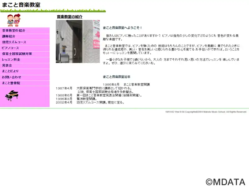 大阪市福島区にあるピアノ教室。3歳から大人まで、基礎からさまざまなレベルに合わせたレッスンを提供。リズム感や音感を養い、豊かな感性を育てることをモットーとし、カワイ演奏グレードテストやピアノライセンスグレードの受験も可能。また、保育士国家試験対策コースも用意している。2年に1度の発表会を開催し、練習の成果を発表する機会を設ける。技術だけでなく、ピアノ演奏を通じて達成感や豊かな心を育てることを重視。