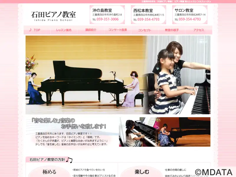 三重県四日市市の沖の島、西松本、サロン教室の3会場で、各個人のレベルや目的・年齢に合わせたピアノ・ソルフェージュレッスンを提供する。石田直美氏が主宰し、1980年に創業。趣味で楽しむ方から本格的な習いたい方まで対応。カワイ・ヤマハグレード、ピティナステップ、指導グレード、各種コンクール、音高・音大受験などで実績多数。2台ピアノでのデュオも指導。定期開催の発表会で、レッスンの成果を披露する機会もある。