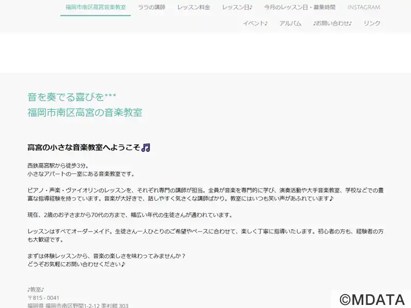 福岡市南区・西鉄高宮駅から徒歩2分にある、アットホームな少人数制の音楽教室。落ち着いた照明とカフェのようなインテリアが特徴で、初めてでもリラックスして学べる空間を提供。ピアノ、声楽、ヴァイオリンのレッスンを開講。初心者から経験者まで幅広く対応。レッスンは完全オーダーメイドで、小さな子どもから70代の大人まで、個々の目標やペースに合わせた指導を行う。保育士試験対策や音楽高校・大学受験コースも用意。
