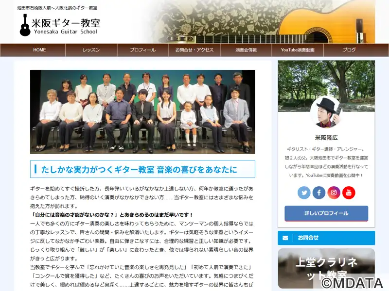 大阪府池田市に位置し、幅広い年齢層から愛されているギター教室。講師は関西を中心に活動する現役ギタリスト、米阪隆広。個々の生徒の目標と希望を大切にし、自信をもって演奏できる力を育てることを重視する。5歳以下の子供から80代まで、個々の目標に応じたレッスンを提供するため、無理なく学べます。固定スケジュールのレッスンはもちろん、月ごとに予約が可能なレッスンも提供し、忙しい生活スタイルにも対応している。