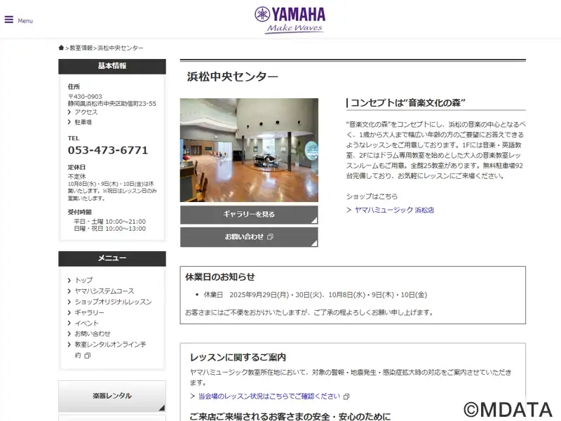 浜松市中区に、「音楽文化の森」のコンセプトで2006年5月開館した、全館25教室のヤマハレッスンセンター。ヤマハ認定講師による共通テキストとカリキュラムに基づくレッスンコースが用意されており、子供向けの「ヤマハ音楽教室・英語教室」と大人にぴったりの「ヤマハミュージックレッスン」「歌って踊れる青春ポップス」、ショップオリジナルのピアノ、エレクトーン、サックス、ギター、ボーカルコースなどを開講している。