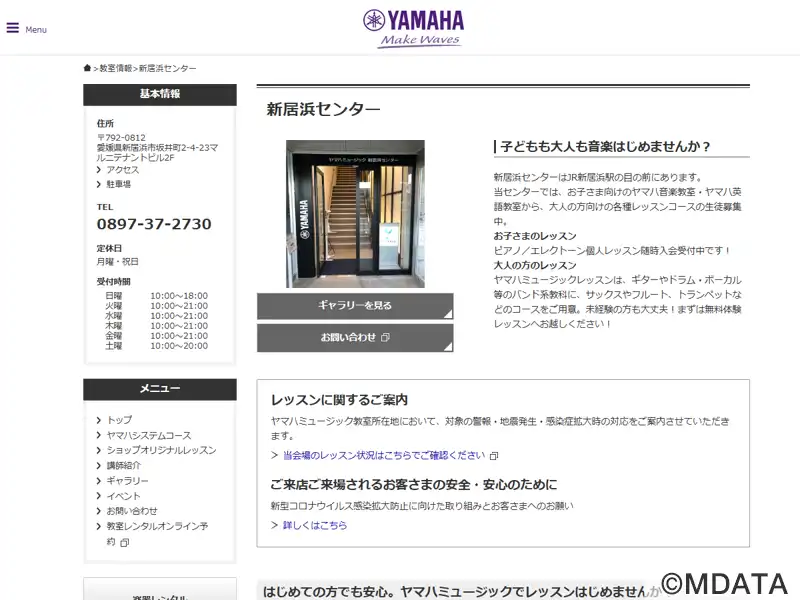 JR新居浜駅前。グループレッスン、個人レッスン、大人から子どもまでの幅広いコースを開講。伸びる時期に伸びる力を楽しく育む適期教育で聴く・弾く・うたう・リズムなどの音楽の基礎力をバランスよく育成。バイオリン、フルート、オカリナ、サクソフォン、ギター、ベース、ドラム、ボーカルなど大人のレッスンも充実。ピアノ・エレクトーン随時体験可。※2022年6月19日以降は教室運営と取り寄せ販売のみに業態変更。