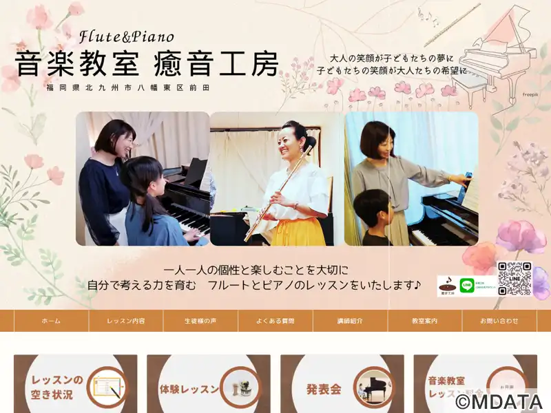 北九州市八幡東区にあるフルート&ピアノの音楽教室。2020年5月、前田2丁目に教室を移転。明るくゆったりとした環境で、一人ひとりの個性と、演奏を楽しむことを大切に、自分で考える力を育むレッスンを提供している。初心者の方、楽譜が読めない方、趣味から本格的なレッスンまで、幅広い年齢層を対象にそれぞれのペースに合わせて指導している。前月に生徒と講師で予定を合わせる予約制で無理なく通えるのも特徴。