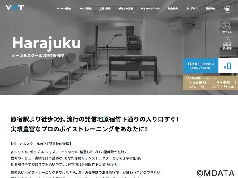 東京都渋谷区の原宿駅近くにあるボーカルスクール。ポップスからアニソン、K-POPまで、幅広いジャンルに対応。経験豊かなインストラクターによるマンツーマンレッスンで、生徒の個性と目的に合わせたカスタマイズされた指導を提供する。プロコースでは、特別レッスンやサポートが充実し、プロを目指す生徒には実践的なオーディションも用意。快適なレッスン環境とフリータイム制度で、無理なくレッスンを受けることができる。