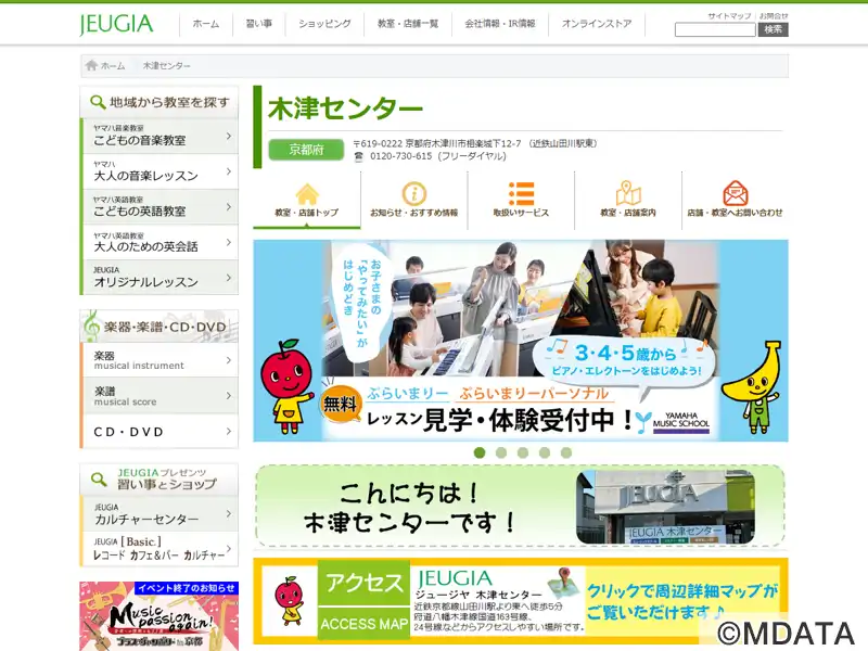 木津川市にある、京都十字屋楽器店のレッスンセンター。ヤマハ認定講師による共通テキスト、カリキュラムでレッスンを行う、音楽を愛するこころ、感受性、創造性を伸ばす、子ども向けの「ヤマハ音楽教室」や、JEUGIA所属講師によるオリジナルレッスンとしてエレクトーン、ピアノ、サックス、フルート、クラリネット、バイオリン、チェロ、ギター、ウクレレ、ドラム、リコーダー、大正琴コースなど多数の講座を開講している。