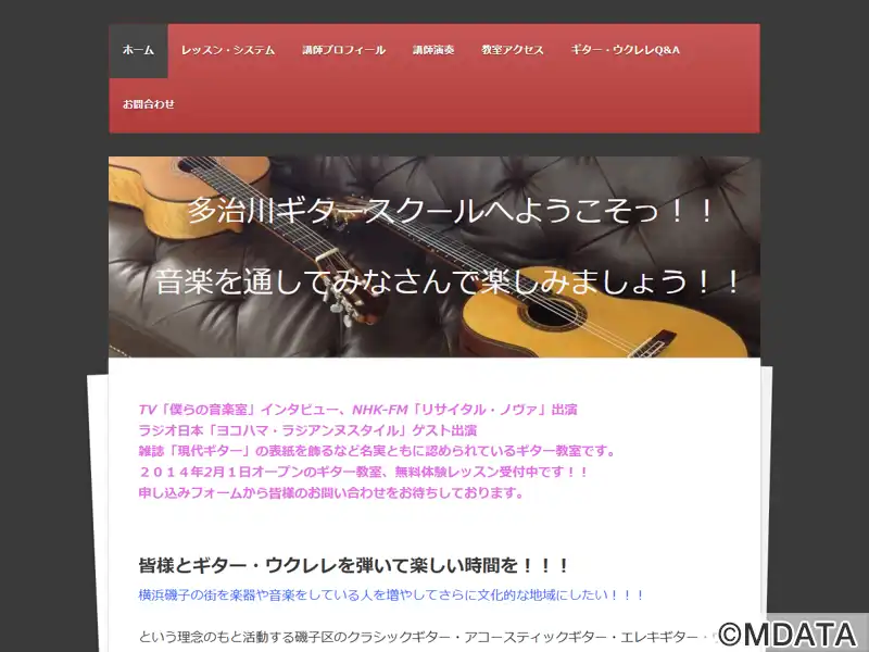 横浜市磯子に2014年オープンしたギター教室。クラシックギター、アコースティックギター、ウクレレを中心に、幅広い音楽ジャンルに対応した個人レッスンを行う。講師は現役ギタリストの多治川純一氏で、初心者から上級者まで、個々のレベルや趣向に応じた丁寧な指導が特徴。小学生からご年配の方まで幅広い年齢層が対象で、楽譜が読めない方や楽器を持っていない方も安心して参加できる。地域に根ざした音楽活動も行っている。
