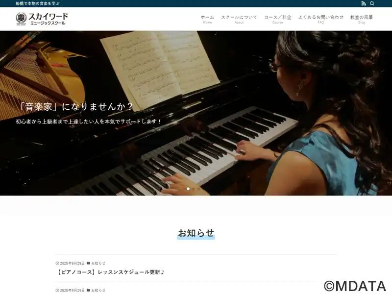 千葉県の京成船橋駅から徒歩5分に位置する音楽教室。幼児音楽、ピアノ、ヴォーカル、ソルフェージュ、クラシックギター、エレキギター・ベースを開講。クラシックからポピュラー音楽まで幅広いジャンルに対応し、海外留学経験を持つ現役演奏家の講師が指導。初心者から上級者まで個別に合わせたレッスンを行い、オンラインレッスンや短期集中レッスンも提供。発表会や演奏活動の機会をサポート。音楽を通じた社会貢献も行っている。