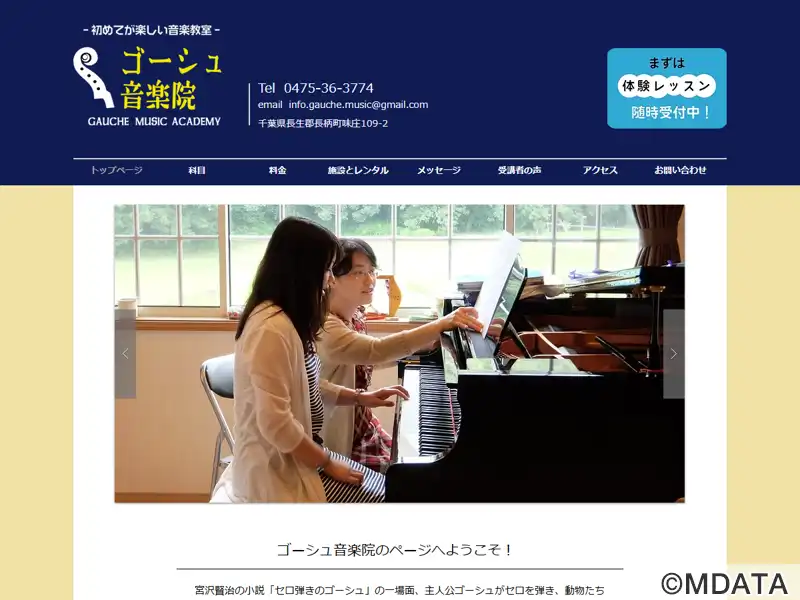 千葉県長柄町にある、こどもから大人まで楽しく上達できる音楽教室。チェロ、バイオリン、ビオラ、ギター、ピアノ、子どものピアノ、フルート、クラリネット、リトミックコースなどを開講。初心者から専門を目指す方まで、ベテラン講師陣による個人レッスンで指導する。2つのレッスンスタジオと、木のぬくもりが優しい40席の音楽ホール(ゴーシュホール)を完備。アンサンブルコンサートやリサイタルを定期的に開催している。