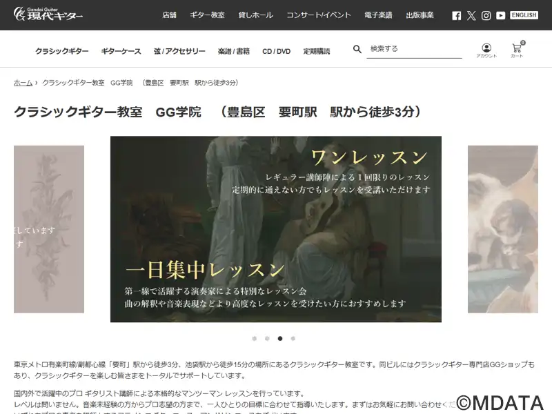 東京都豊島区に位置する、クラシックギターを中心にフラメンコギターやマンドリンのレッスンを提供するギター教室。国内外で活躍するプロギタリストが講師を務め、初心者からプロ志望者まで幅広いレベルに対応したマンツーマン指導を行う。楽器を持っていなくても教室の貸しギターを利用できる。アンサンブルを楽しむギターサークルも開催し、仲間と音楽を奏でる喜びも味わえる。ギターを通じて本格的な音楽の世界を体験できる。