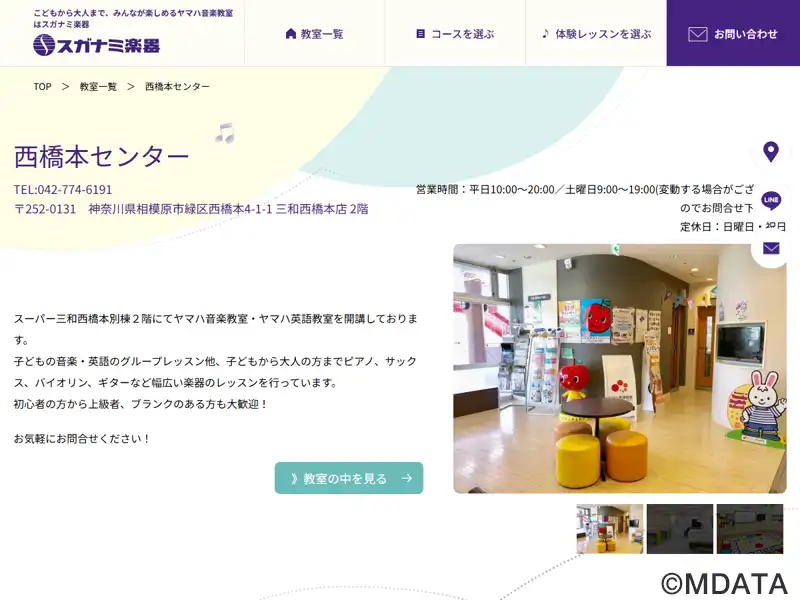 神奈川県相模原市のスーパー三和西橋本別棟の2階にあるスガナミ楽器のレッスンセンター。子供向けのヤマハ音楽・英語教室や、大人向けのヤマハ「歌って踊れる青春ポップス」、スガナミオリジナルレッスンなどを開講。子どもから大人まで、初心者から経験者までを対象に、ピアノ、エレクトーン、フルート、バイオリン、サックス、ギターなどの個人レッスンを行っている。教員採用試験実技コースもあり。無料駐車場も利用できる。