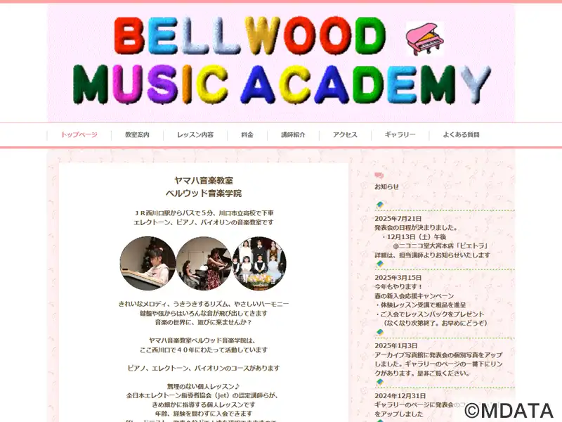 埼玉県西川口で40年以上の歴史を持つ音楽教室。ヤマハ音楽教室として、初心者から経験者までを対象としてピアノ、エレクトーン、バイオリンの個人レッスンを提供している。全日本エレクトーン指導者協会(jet)認定の講師が、年齢や経験に関わらず生徒一人ひとりに合わせた指導を行っている。音楽を楽しむことを重視した教育方針が特徴で、グレードテストや発表会を通じて上達を確認できる。大人向けのレッスンも充実している。