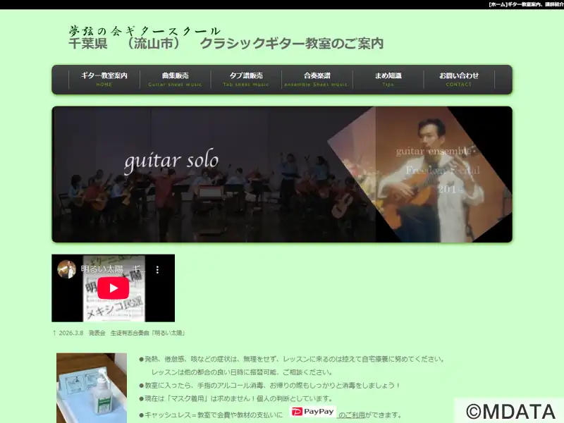 千葉県流山市に1992年開校したクラシックギター教室。個人レッスンを中心に提供している。「楽しく演奏できるようになる」ことを目標に、ひとりのペースに合わせた指導を行なっている。カルチャーセンターでのグループレッスンやアンサンブルも開催し、音楽を通じたコミュニティ形成にも力を入れている。ギターを初めて手にする初心者向けのレッスンもあり。貸しギターも用意している。音楽を通じて「夢」を追求する場を目指す。