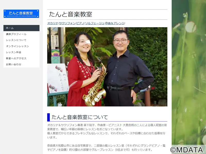奈良県大和郡山市にあるサックス・オカリナ・ピアノ・作曲・ソルフェージュの音楽教室。個人運営によるアットホームな環境で、作曲家・ピアニストの大島忠則氏とサクソフォン・オカリナ奏者の森下知子氏が指導。幼児から大人、音大受験生まで、年齢や経験に応じた柔軟なカリキュラムを提供。ピアノは創造力、サクソフォンはソロやアンサンブルで表現力を養う。オカリナや作編曲も学べ、音楽の楽しさを深く体験できる場となっている。