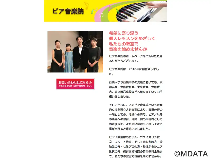 兵庫県姫路市に2010年創立した音楽教室。ピアノを中心に、ヴァイオリンやフルートのレッスンを提供。幼児からシニア世代まで幅広い年齢層を対象とする。ピティナ・ピアノコンペティションや兵庫県学生ピアノコンクールなど、多くのコンクールで生徒の受賞歴があり、音楽大学や音楽高校の受験指導にも力を入れる。講師陣は音楽大学卒で、高い演奏能力と豊富な指導経験を持ち、生徒一人ひとりに合わせた個別レッスンを行っている。