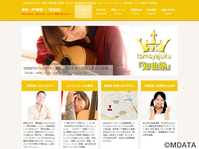 埼玉県さいたま市にあるギター・ボイトレ教室。音楽プロデューサーの倉川知也氏の運営で、ギター、ボーカル、ベース、パソコンなど、幅広い指導を行っている。実践的なレッスンを提供し、生徒の真の上達を目指す。効率的な学習を促進するために、レッスンの時間配分に工夫を凝らし、さらに月謝制度を廃止するなど本気で取り組める環境を整えている。音楽を通じて人生を豊かにすることを目標としている。オンラインレッスンに対応。