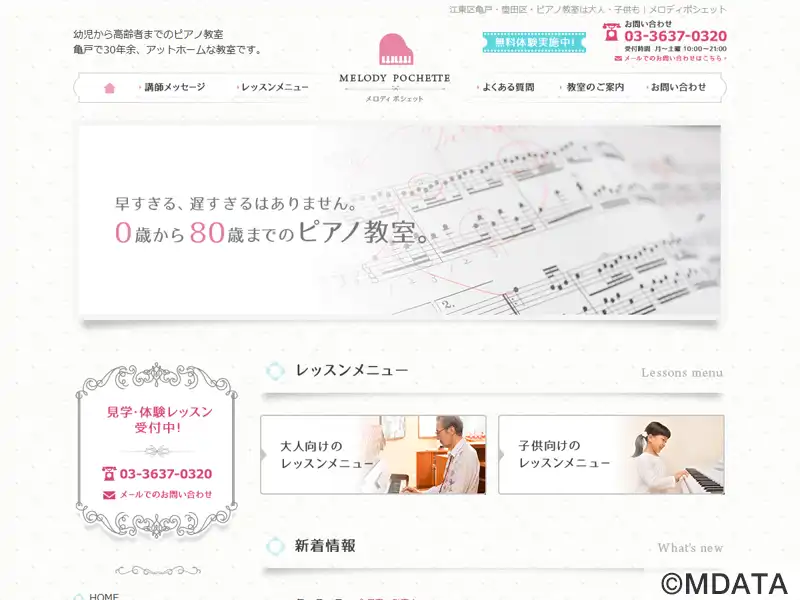 江東区亀戸のアットホームなピアノ教室「メロディポシェット」。幼児からシニアまで対応し、クラシック、ポピュラー、ソルフェージュ、コーラスなどジャンル豊富。個別ニーズに合わせ、楽しむ方法を追求。子ども向けの、ソルフェージュ、聴音、楽典など幅広く音楽に触れ、創造性豊かな子供を育てる「幼児、学童コース」、を初め、「親子レッスンコース」、大人向け「50歳からのピアノコース」など、多彩なレッスンを用意している。