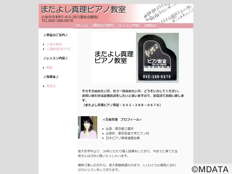 東京都小金井と三鷹でレッスンを行う音楽教室。豊富な指導経験を持つ、またよし真理氏(東京音楽大学ピアノ科卒)が主催する。3歳からシニアの方まで、趣味として楽しむ方や音大受験を目指す方に向けて、個性を大切にした、マンツーマンレッスンを提供する。子供にはソルフェージュを含めた基礎をしっかり教え、大人の方には「毎回を楽しく」をモットーに、ワンレッスン制や出張レッスンも対応。質の高いピアノ教育を提供している。