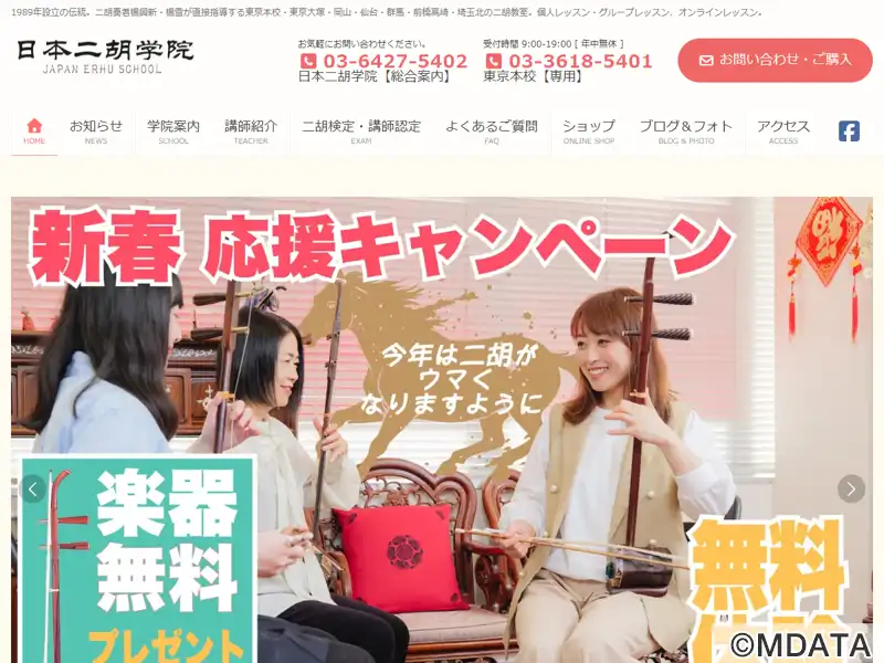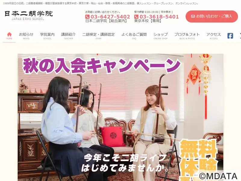 東京都墨田区の本店を中心に、岡山、仙台、群馬(前橋・高崎)で、レッスンを開講している二胡専門教室。各個人の特性を尊重した個別レッスン制を採用し、初心者から上級者まで、広範なレベルの受講生に対応する。中・上級者には、心に響く音楽を演奏するための確かな技術指導する。経験豊富な講師陣が、二胡の演奏技術はもちろん、中国文化についても学べる環境を提供する。完全個人レッスン制、無料体験レッスンも開講している。