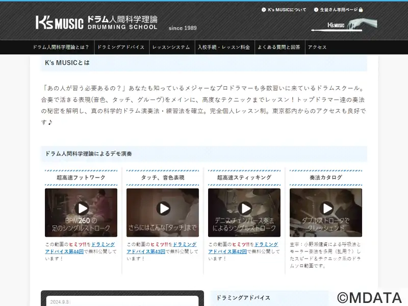 さいたま市与野にある、プロドラマーも学ぶドラム教室。音色、タッチ、グルーヴに焦点を当てたレッスンを提供し、奏法テクニカルレッスン、人体力学、フットワーク、フォームにも注目している。多岐にわたるカリキュラムには課題曲演奏や音楽表現レッスンも含まれ、完全個人レッスン制を採用している。トップドラマーの奏法の秘密を解明し、科学的なドラム演奏法と練習法を確立。「人間的な色気と気持ちを伝える音楽」を追求する。