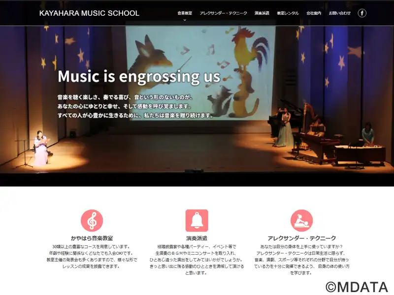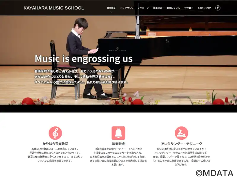 静岡県富士市を拠点に、県内各地でレッスンを行う音楽教室。ピアノ、バイオリン、フルート、ギター、管楽器、打楽器、声楽など、30種類以上の多彩なコースを開講している。幼児から大人まで、年齢や経験を問わず、一人ひとりの目標やレベルに合わせたレッスンを提供。音高・音大受験対策や、ソルフェージュ・楽典・聴音を取り入れたコースも充実。レッスン日時や回数も柔軟に選択可能。音楽を通じて自己表現や成長をサポートする。