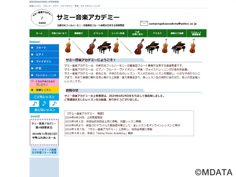世田谷区上町にある、元新日本フィルハーモニー交響楽団フルート奏者が主宰する音楽教室。ボロ市通り沿いの青いビルが目印。ピアノ、フルート、ヴァイオリン、声楽・歌・ヴォイストレーニングの各科を設置し、子どもから大人まで、 初心者から音大受験生まで、完全個人レッスン制で、目標に合わせたレッスンプログラムを用意。受験対策やオーディション、健康のためのヴォイストレーニング講座も開設している。