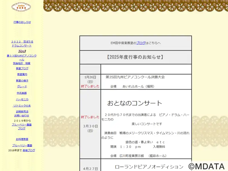 福岡八女市にある音楽を通じて快適な生活スタイルを提案する音楽教室。いつも笑顔が絶えない楽しいレッスンが魅力。リトミック科は2歳から、ピアノ科は3歳から成人まで対象。小中学生や音大受験生に向けのソルフェージュ科や、保育士資格の試験対策科も開講。ピアノとドラムのコースは3歳から受けられ、フルート科では初心者にも優しいレッスンもある。PIARAピアノコンクールやグレード対応、コンサートイベントも定期開催する。