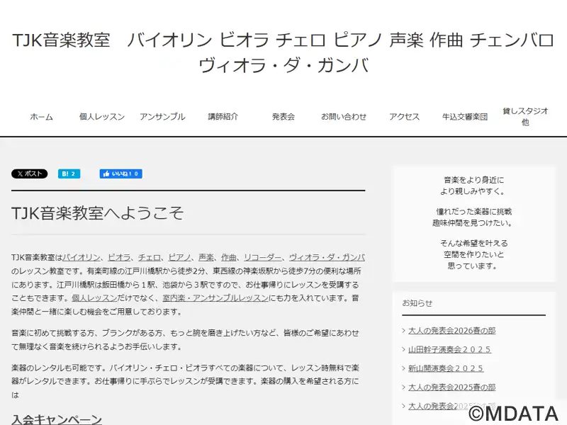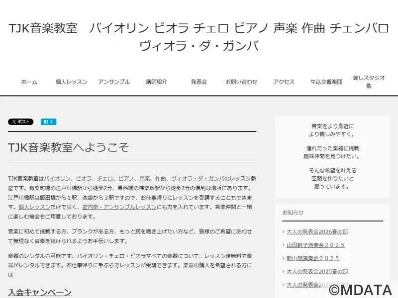 新宿区・江戸川橋駅近くにある音楽教室。幼児からシニアまで幅広い年齢層に対応し、バイオリン、ビオラ、チェロ、ピアノ、声楽、作曲、リコーダー、ヴィオラ・ダ・ガンバなどの個人レッスンを提供する。また、弦楽アンサンブルやピアノトリオなどの室内楽・アンサンブルクラス、チェロアンサンブルや弦楽カルテットのレッスンも行っている。ジュニアクラスでは発表会も開催。スタインウェイピアノを備えた貸しスタジオも利用できる。