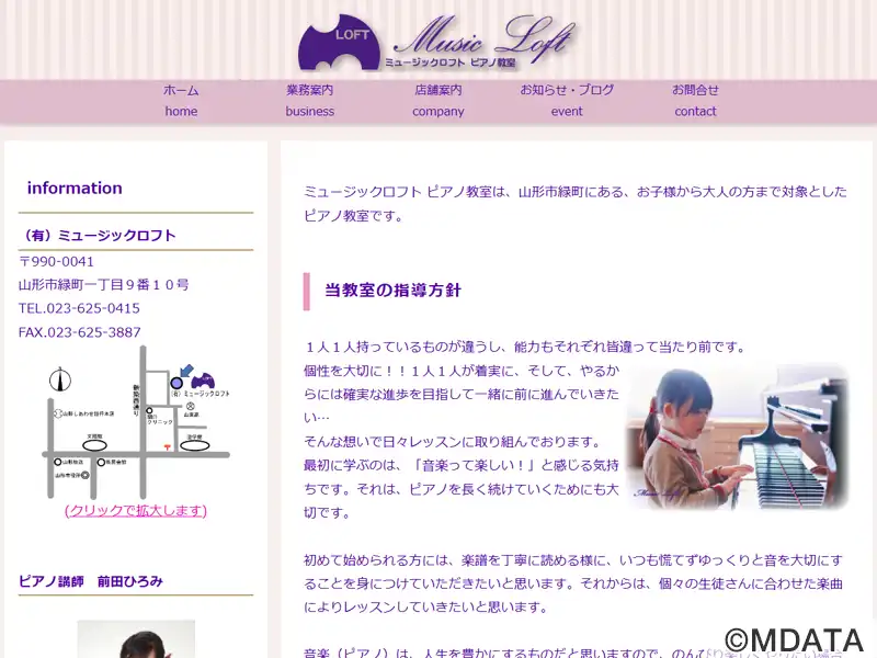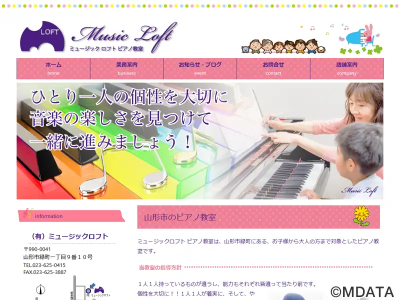 山形市緑町にあるアットホームなピアノ教室。子供から大人まで、初心者からコンクールを目指す方まで、一人ひとりの個性を尊重したレッスンを行う。音楽の楽しさを大切に、無理なく丁寧な指導を心がけ、継続を通じて音楽的成長と達成感を育む。グランドピアノC3を備えた防音レッスン室は、コンクール前の集中練習や伴奏合わせ、管楽器の練習にも最適。ピアノ調律、運搬、販売(新品・中古)、レッスン室の貸し出しも行っている。