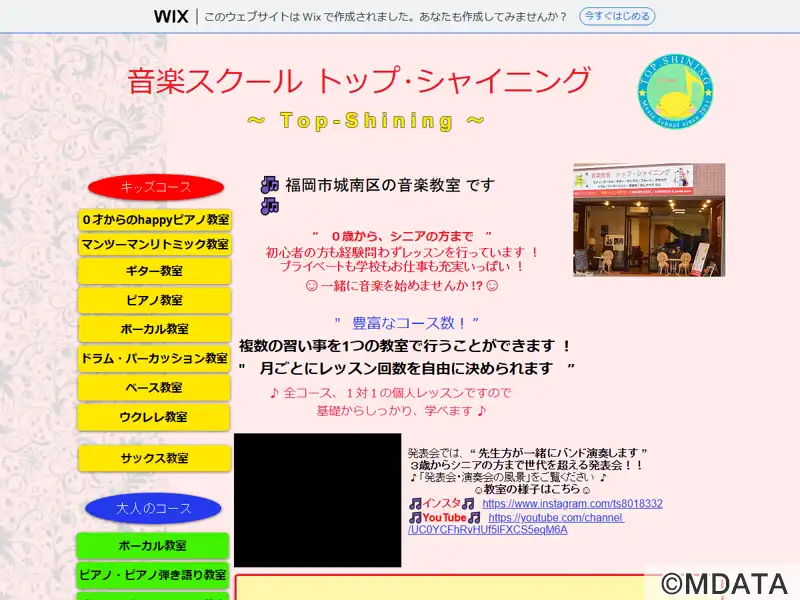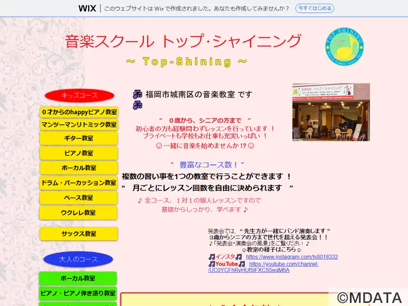 福岡市城南区にあるアットホームな音楽スクール。0歳からシニアまで、初心者から音大受験生まで、幅広い年代と目標に対応。ピアノ、ギター、ボーカル、ドラム、サックス、作詞作曲など多彩なコースを個別指導で提供。月1回からの柔軟なスケジュールで、初心者も安心して学べる。発表会では生徒同士や講師とのバンド演奏も可能。楽器貸出しもあり、個々のペースに合わせた指導で、音楽を通じた自己表現を育む環境が整っている。