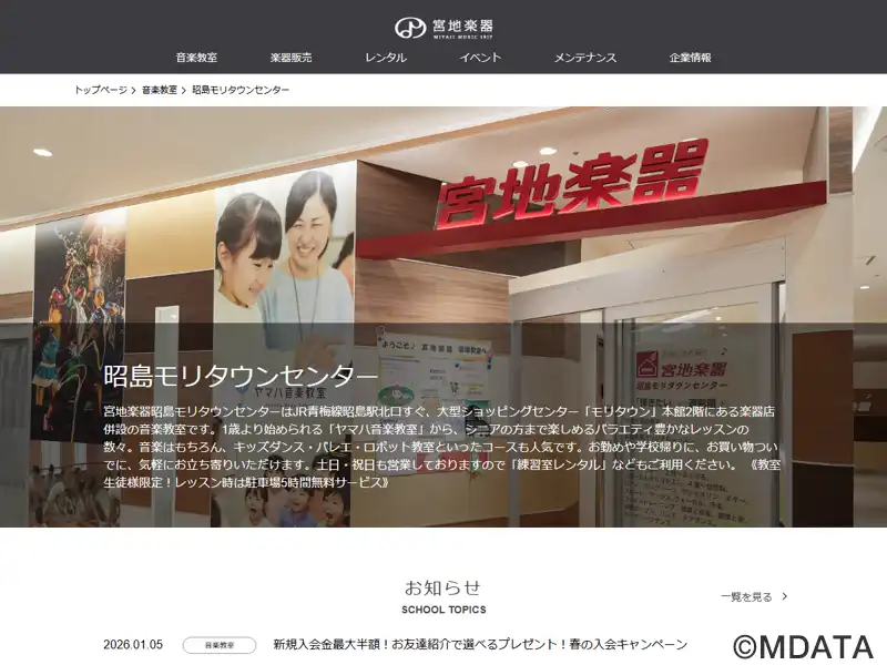 東京都昭島市のJR青梅線昭島駅北口からすぐの昭島モリタウン本館2階に、2019年に移転オープンした宮地楽器のレッスンセンター。1歳から参加できるヤマハ音楽教室をはじめ、シニア向けレッスン、キッズダンス、バレエ、ロボット教室など多彩なコースを開講している。また、個人やグループの練習に利用できる、練習室のレンタルサービスも提供していて、土日祝日も営業している。音楽を通じて豊かな生活をサポートしている。