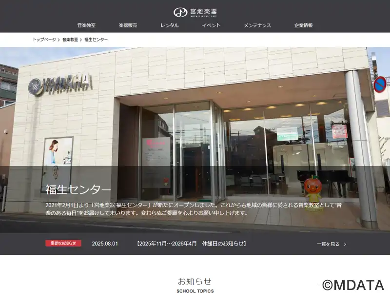 2021年2月よりヤマハミュージックリテイリングから宮地楽器に教室運営を移管。旧福生駅前センターの全レッスンを移転統合し、新「福生センター」として運営。ピアノ・エレクトーン、ギター、ベース、ドラム、ウクレレ、バイオリンや管楽器、声楽・ボーカル、健康と音楽など、子どもから大人まで幅広いコースを開講。「音楽のある毎日」にしてみませんか?練習室レンタルあり。福生駅(東口徒歩7分。