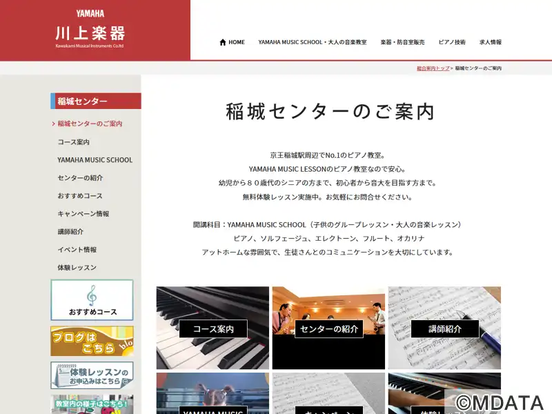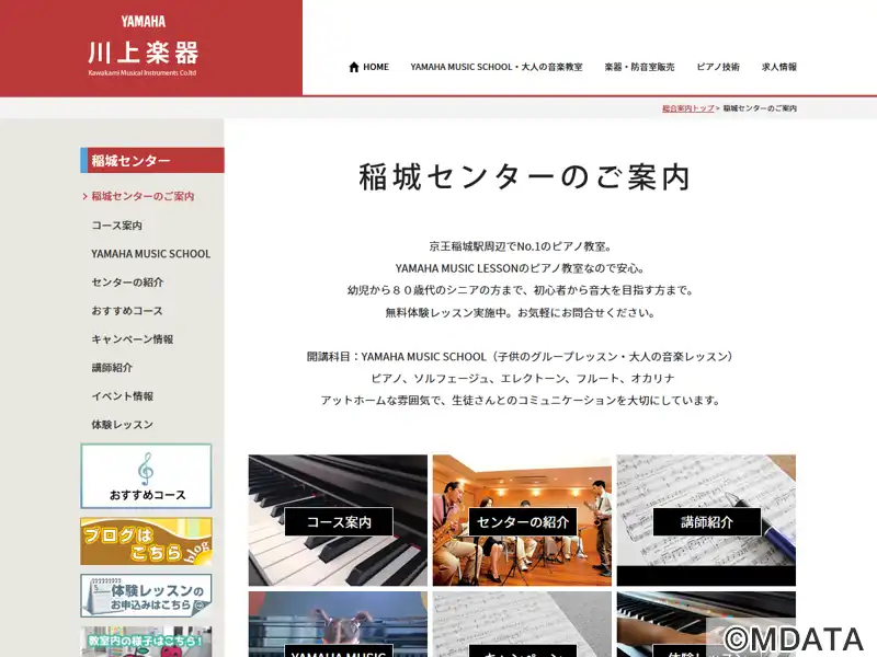 東京都稲城市の京王稲城駅から、徒歩すぐの場所にある川上楽器のレッスンセンター。アットホームな雰囲気の中で、幅広い年齢層の方々が一人一人のペースとレベルに合わせたレッスンを開講。ピアノ、バイオリンのオリジナルレッスン、ヤマハ認定講師による共通テキストやカリキュラムに基づいた子ども向けの「ヤマハ音楽教室」などを開講。シニア世代や初心者の方々まで、コミュニケーションを大切にしながらレッスンを行っている。